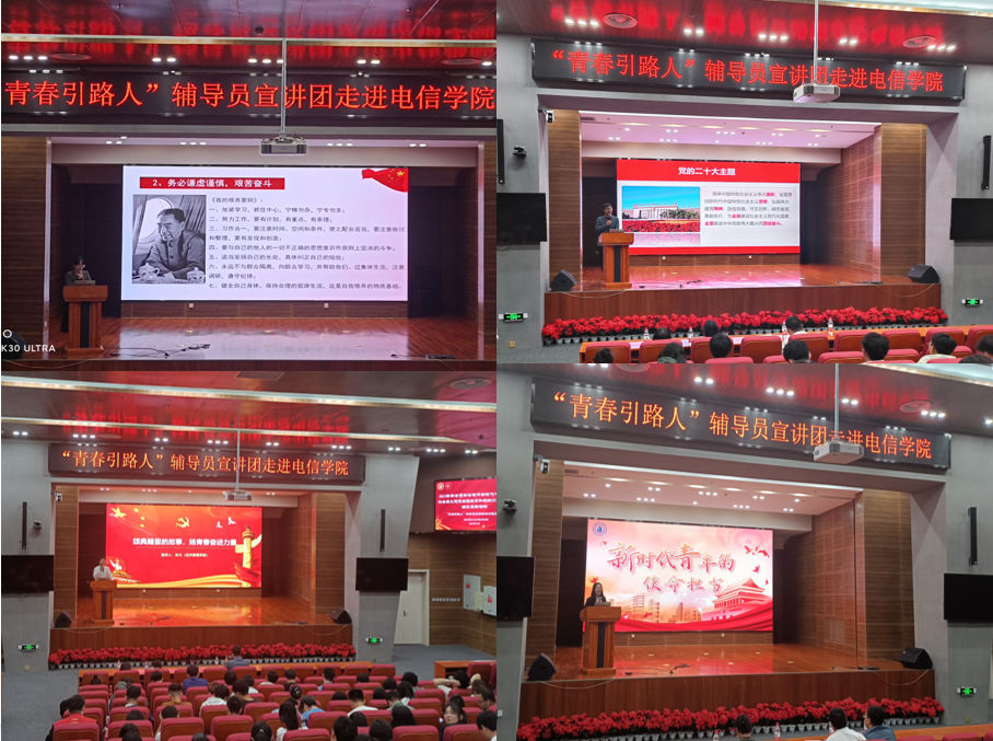 会上“青春引路人”辅导员宣讲团成员、经济管理学院辅导员贾永胜以《奋进新征程 青春正当时》为题,从陈祥榕烈士日记中“清澈的爱,只为中国”出发通过鲜活事例讲述了党的二十大精神。经济管理学院辅导员张凡以《颂典籍里的故事,扬青春奋进力量》为题结合林觉民烈士写下的绝笔《与妻书》,让在场同学感受铁骨铮铮、视死如归的革命精神。石油化工学院辅导员朱建芳以《牢记“三个务必”,践行时代使命,争做时代新人》为题,从“三个务必”的重要内涵和重大历史意义出发,鼓励同学们坚定历史自信、增强历史主动、奋力谱写新时代中国特色社会主义更加绚丽的华章。理学院辅导员翟亚男以《新时代青年的使命担当》为题,从学生志愿者身上发掘优秀事迹,鼓励同学们“青年有担当 国家有力量”。电信学院辅导员成晨以《青春遇见新时代——从三件大事看十年伟大变革》为题,结合十年来对党和人民事业具有重大现实意义和深远历史意义的三件大事,讲述了新时代伟大成就。