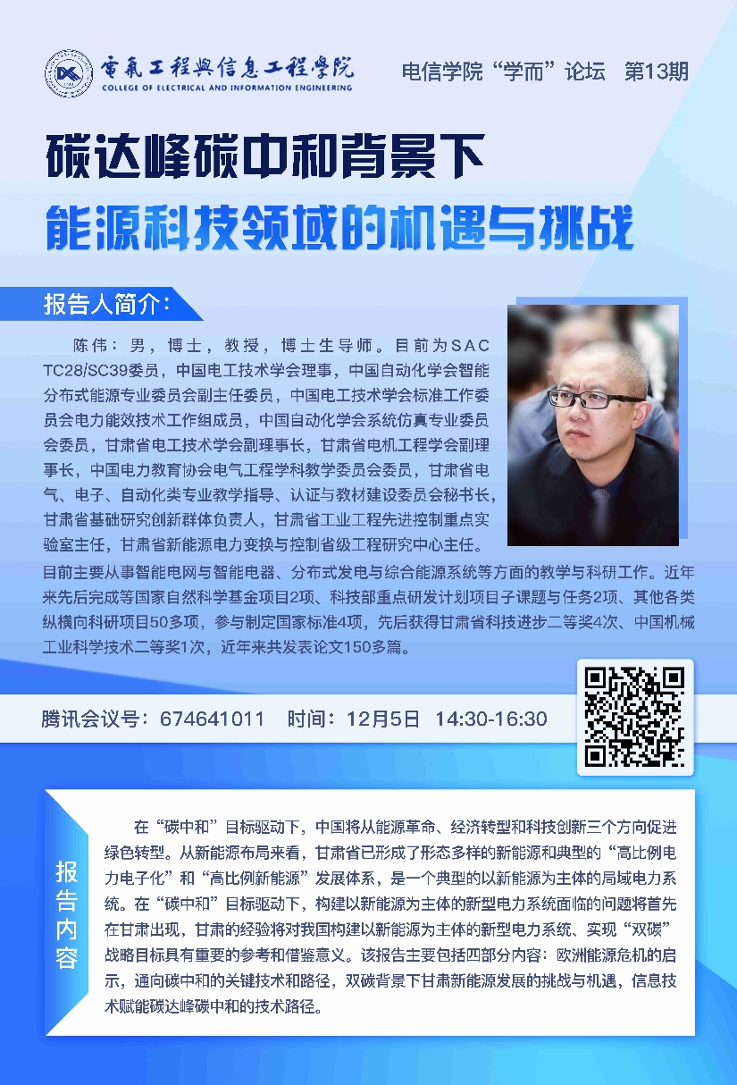 12月5日,由兰州理工大学电信学院举办的第13期学而论坛——“碳达峰碳中和背景下能源科技领域的机遇与挑战”在腾讯会议线上召开。会议邀请了电信学院院长陈伟教授作报告,会议由电气工程系主任张宏亮副教授主持。电信学院200余名师生参加了此次学术论坛。