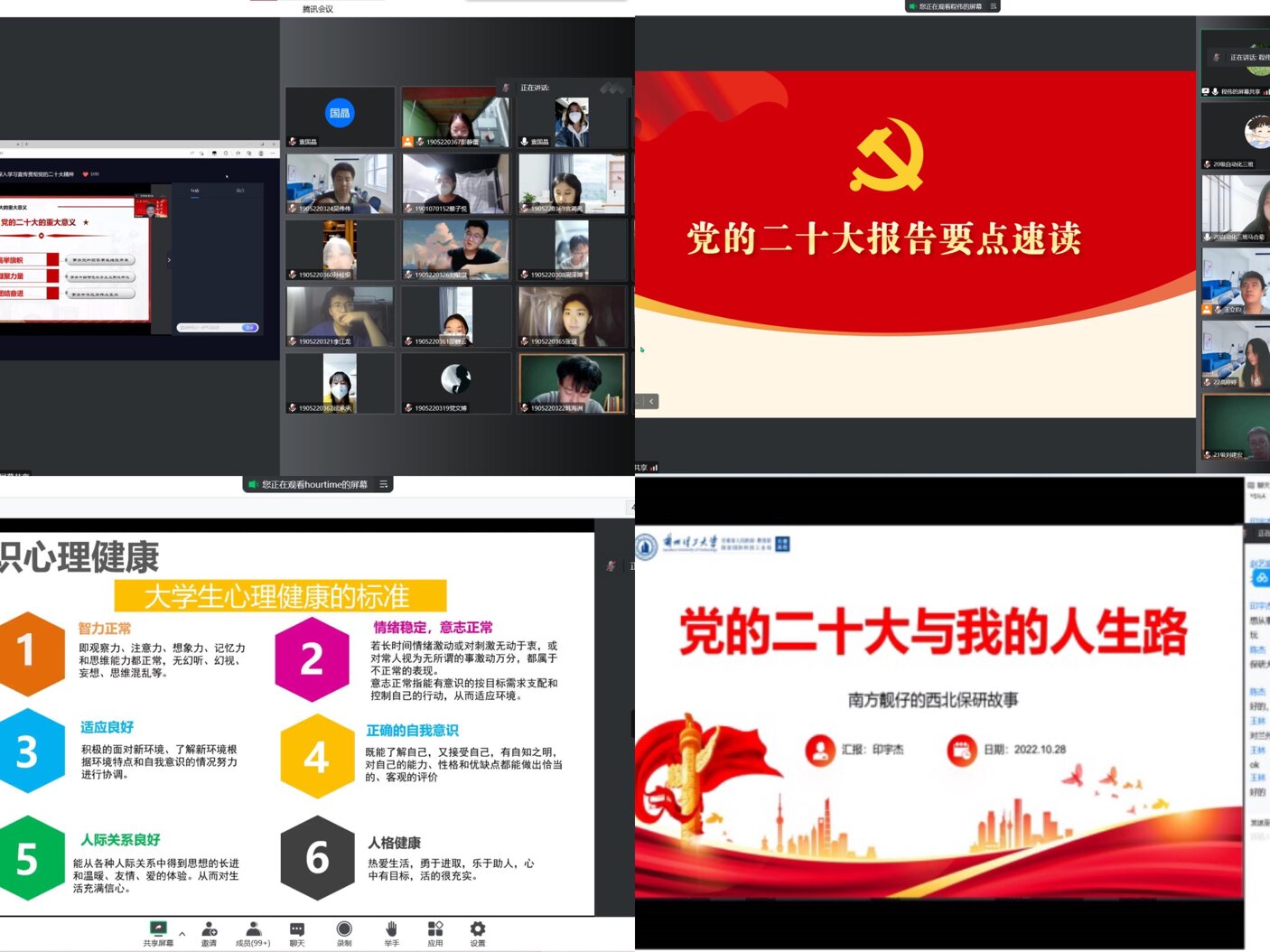 面对“疫情输入”的压力,怎样才能让封闭在校内的学生学习好,生活好,身体好,保证各项工作不掉线?学院党委认真学习贯彻习近平总书记关于疫情防控工作的重要讲话和指示精神,积极筹划、认真组织、群策群力,将伟大的抗疫精神融入到三全育人当中。疫情初期,电信学院领导班子走访学生宿舍,进一步落实以宿舍、楼层为单位的学生网格化管理工作体系,督促落实学生线上教学和身心健康安全;策划“尚学电信”线上学风建设系列活动,变宿舍为书房、宿舍为教室,坚持“疫情防控”和“学风建设”两手抓;召开党团班协同抗疫工作会议,发挥党团班一体化管理优势,发挥党员干部疫情面前的引领作用;召开“疫情防控暨学风建设”主题教育班会进一步强化学生安全防范意识,筑牢安全思想防线,共建健康校园;组建学生志愿队伍,积极参与到核酸检测、便民服务、秩序维护等志愿服务中;召开2023届毕业生线上就业宣讲会,走进云端促就业工作;举办线上“电信学院青年博士学术讲座暨2021级研究生入学教育系列活动-‘研途’生活分享”活动,确保“听课不停学”“停课不停教”;邀请校团委老师开展“快乐成长,健康生活”——2022级新生心理健康讲座,安抚因突如其来的疫情可能引起学生们的紧张、不安等情绪;开展学习“二十大精神”主题党团日活动、“党的二十大与我的人生路”研学专题活动、“同心抗疫 共克时艰”主题班会、“你好,电信”爱校主题教育等活动,变“面对面”为“键对键”,激励广大学子攻坚克难、开拓创新,引领学生坚定抗疫必胜信念。运筹帷幄,决胜千里,他们始终坚定必胜信念,云端守望,不遗余力为学校教书育人保驾护航。