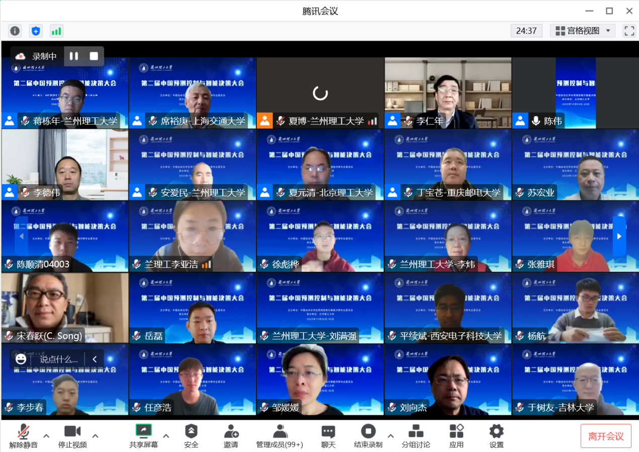 10月29日至10月30日,由中国自动化学会和中国自动化学会预测控制与智能决策专业委员会主办,我校电信学院承办的“第二届中国预测控制与智能决策大会” 通过腾讯会议的形式在线召开。中国自动化学会第七、第八、第九届理事会副理事长席裕庚教授、中国自动化学会预测控制与智能决策专业委员会主任委员李德伟教授、兰州理工大学李仁年副校长、兰州理工大学电信学院院长陈伟教授以及来自全国高等院校、科研院所和企业的近700名专家学者和青年学生参加了此次会议。会议由大会报告、青年专家专题报告和评奖论文报告组成,李德伟教授和陈伟教授担任大会主席,华北电力大学刘向杰教授担任大会报告主席。