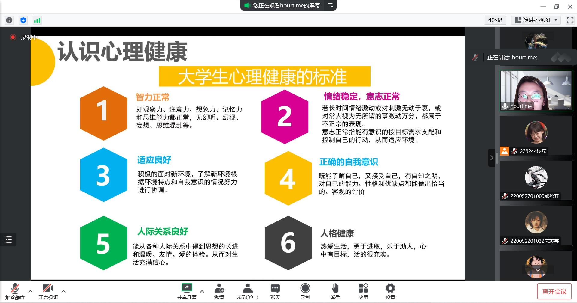 自新生入学以来,新冠疫情打破了正常的开学秩序,线上上课的形式给同学们带来了或多或少的焦虑感,宿舍学习环境和同学之间的矛盾摩擦也有颇多不快。为维护疫情期间学生的心理健康,10月24日晚上,电信学院邀请了校团委崔效艳老师给同学们带来“快乐成长,健康生活”的心理健康主题讲座。电信学院22级全体学生聆听了讲座,并发表各自的看法。