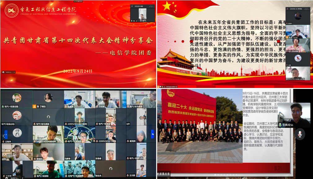 9月15日上午,共青团甘肃省第十四次代表大会在兰州开幕,这是在喜迎党的二十大召开的重大时刻召开的一次重要的青春盛会,也是全省青年政治生活中的一件大事。电信学院团学青年迅速学习领会会议精神,结合学习工作实际,谈收获、谈感受,围绕省第十四次团代会精神,交流分享学习心得。