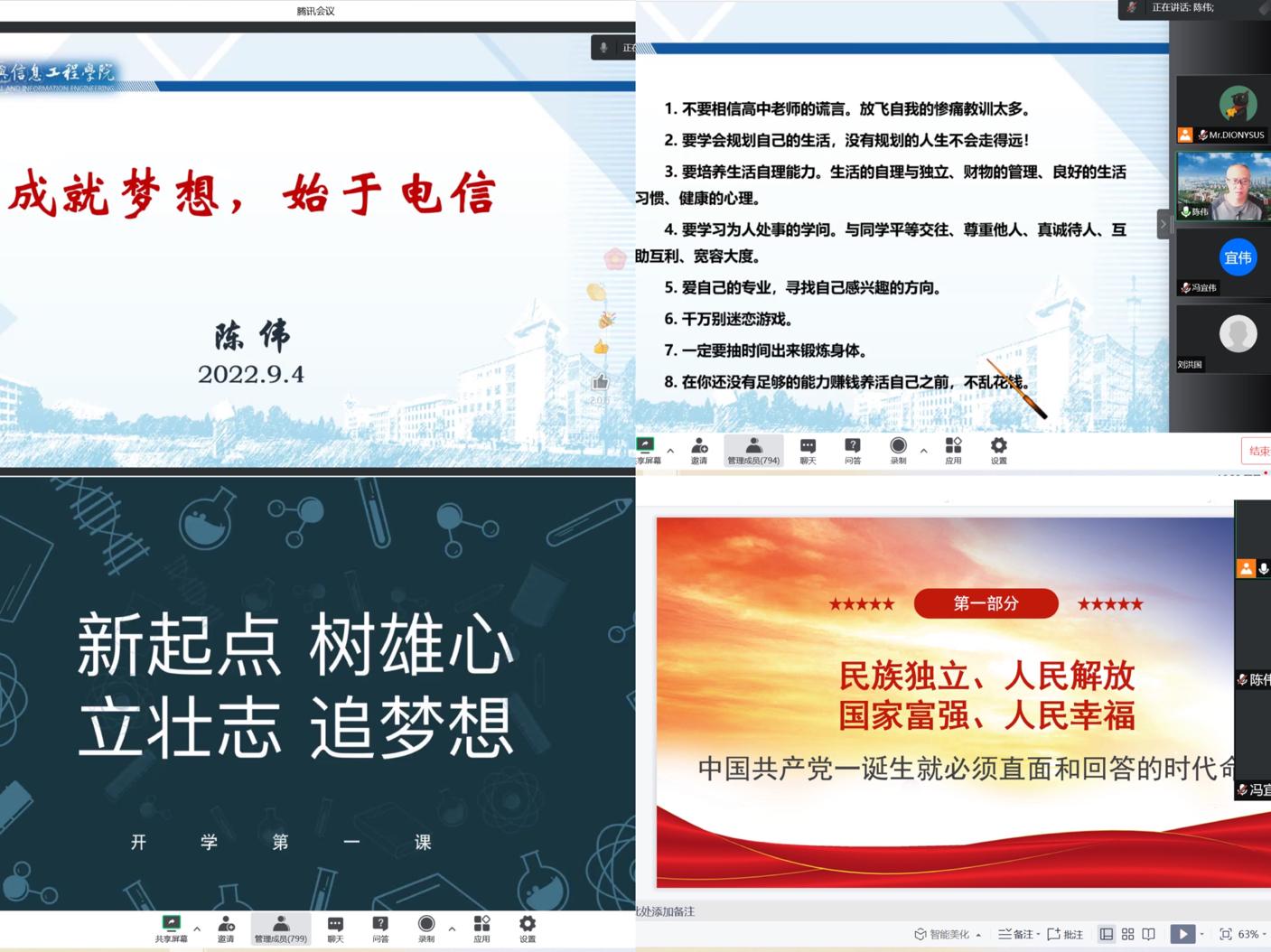 2022年9月4日,电信学院通过腾讯会议举办2022级“大学第一课”新生入学教育暨新生入党启蒙第一课活动。学院邀请学院党委书记王玲、学院院长陈伟、学院党委副书记刘洪国、学院副院长冯宜伟担任主讲嘉宾,800余名2022级研究生、本科生及学生家长参加了本次活动。