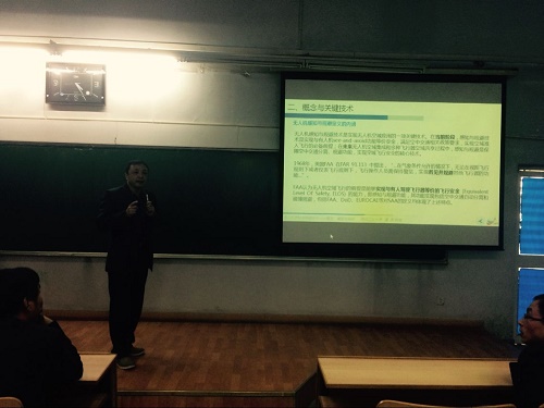 报告会上,潘泉教授对一种空地协同的无人机感知规避系统进行了介绍,包括在飞机上设置的视觉感知系统、图像处理系统和飞行控制系统。还讲解了空地协同的无人机感知规避系统的规避方法,对现有技术中存在的纯地面控制无人机飞行航迹的来规避飞行器飞行轨迹的不确定性,以及单纯无人机自主空中规避障碍物的不确定性提供了解决方法。潘教授的报告,风格诙谐幽默,思路深入浅出,给在座师生留下了深刻的印象。最后,潘教授与参会师生进行了良好互动,张院长对此次的学术报告进行了总结,希望老师和同学们汲取报告精华,会议在热烈的气氛中结束。