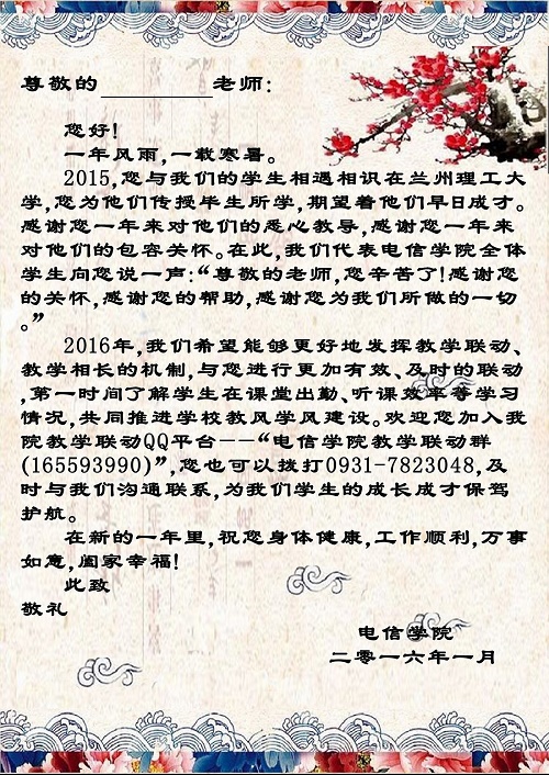 为了加强与任课教师沟通联系,更好地发挥教学联动、教学相长的机制,2016年1月11日至14日,电信学院为学院本科生一、二年级的125名任课老师,送上了感谢和祝福。学生代表们向任课教师一年的辛勤付出表示感谢,感谢老师们一年的教导和帮助,感谢老师们为学生的成长成才所做的工作。