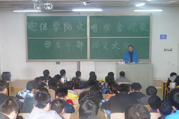 为了推进我校文明建设,构建和谐校园,电信学院于11月13日12:30在西校区2号教学楼504教室召开了文明宿舍建设学生干部动员大会,11级辅导员李正安老师主持了本次会议。