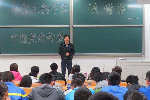 10月26日晚,电信学院“中国梦,我的梦”演讲比赛在4号楼2O5教室成功举行。各班代表依次进行演讲。 赛中,各位参赛选手就习近平主席提出的“中国梦,我的梦”主题做了精彩的演讲,阐述了由自我的小梦到祖国繁荣富强的大梦的转变,深刻彰显了“中国梦,我的梦”这一主题的内涵。最后,电信学院荣幸邀请到兰州军区的一位营长为获奖选手颁奖。