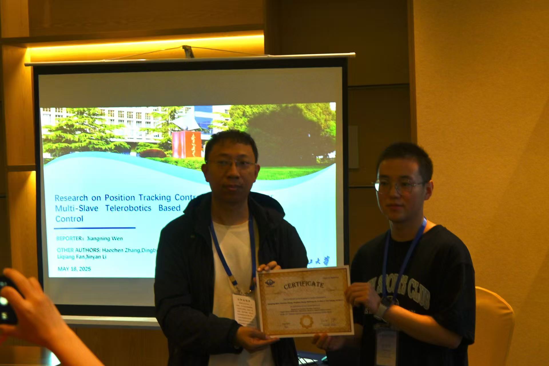 本届会议面向人工智能、机器人、新能源控制等前沿领域,共组织了大会报告4场、讲座9场、论坛7场、主题研讨会7场、特别专题28场、分会场报告120场、互动海报张贴9场。我院2023级研究生温江宁代表课题组做了题为“Research on Position Tracking Control of Single-Master Multi-Slave Telerobotics Based on Adaptive Robust Control”的分会场报告,该工作针对多机器人协同控制提出了一种改进的交互控制架构。