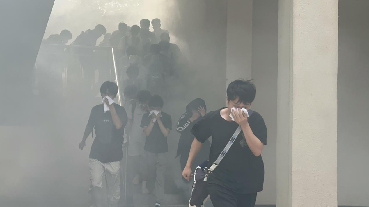 理论学习后,一场模拟真实火情的应急疏散逃生演练在楼道展开。警报响起、烟雾弥漫,同学们在工作人员引导下,严格遵循“弯腰、低姿、捂口鼻”要求,沿安全路线有序撤离至集合点。过程组织严密,高效检验预案,提升逃生自救能力。