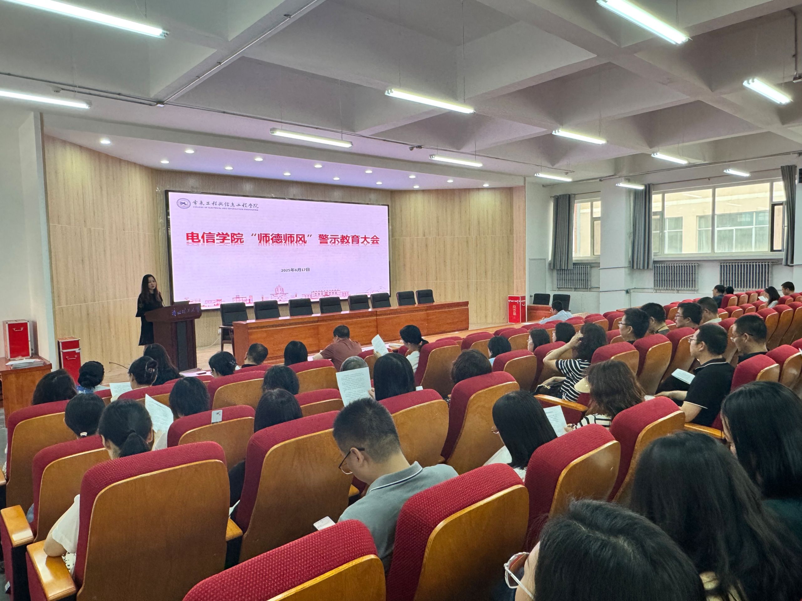 为深入贯彻中央八项规定精神学习教育,进一步加强师德师风建设,引导广大教师坚守教育初心、践行育人使命,6月17日电信学院召开师德师风警示教育大会。学院全体教职工参加会议,会议由学院党委书记杨雅琼主持。