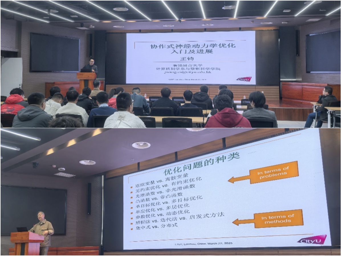 3月22日下午,电信学院自动化系携手学院柔性引进专家兰州大学金龙教授,特邀香港工程院院士、香港城市大学计算机科学系和数据科学学院计算智能讲座教授王钧教授,为我院师生带来了一场题为《协作神经动力学优化的最新进展》的精彩学术报告。本次报告会由学院副院长李二超教授主持,吸引了学院百余名教师和研究生积极参与。