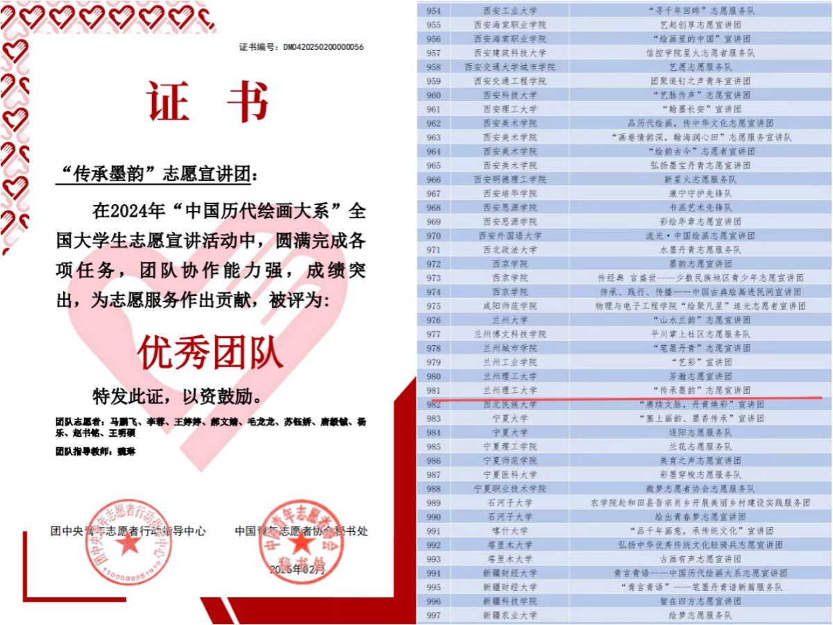 为深入学习宣传贯彻党的二十大精神、党的二十届三中全会精神和习近平文化思想,落实“强国复兴有我”群众性主题宣传教育活动相关要求,推动中华优秀传统文化的传承发展和国际交流,团中央青年志愿者行动指导中心、教育部中外语言交流合作中心、中国外文局文化传播中心、浙江大学、中国文物报联合发布了《关于遴选2024年“中国历代绘画大系”全国大学生志愿宣讲团的公告》。电信学院“传承墨韵”志愿宣讲团成功入选千支大学生志愿宣讲团,并于近日被评为优秀团队。