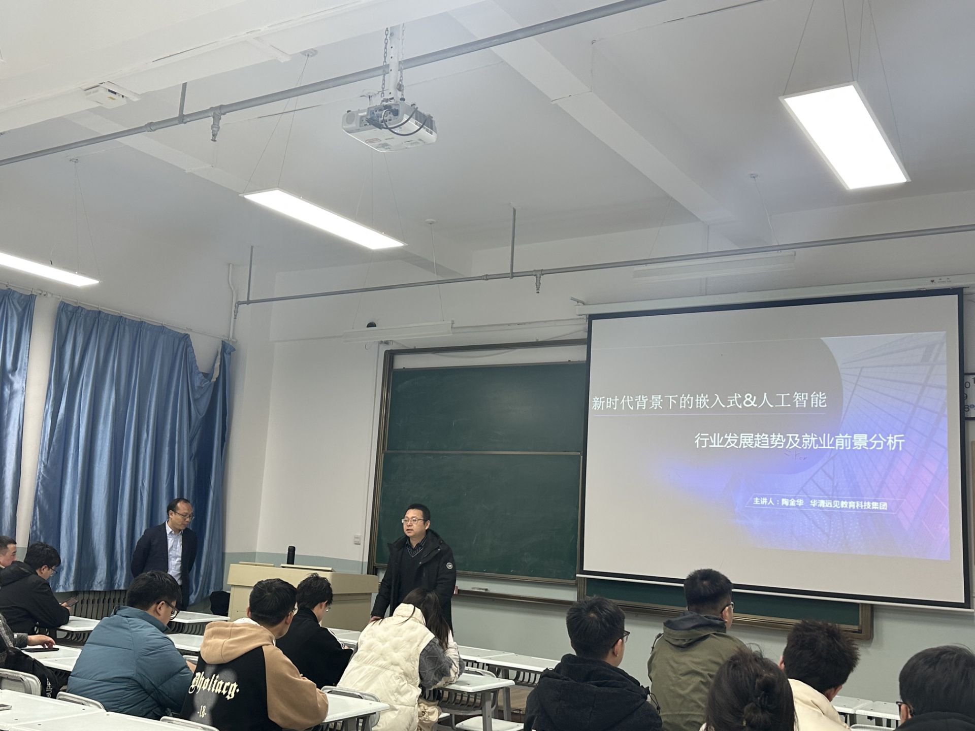 随后,学院邀请华清远见教育科技集团的陶金华副总裁作了精彩的专题讲座——“新时代背景下的嵌入式&人工智能行业发展趋势及就业前景分析”。陶老师从行业发展趋势、前景、就业方向和岗位等多个角度进行了深入浅出的讲解。他详细分析了嵌入式和人工智能行业的现状和未来发展趋势,以及这些行业中的就业机会和成功案例。他还特别强调了春招的重要性,并就如何准备春招、如何提高春招成功率等问题给出了宝贵的建议。