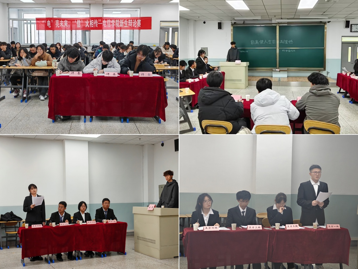 为深入贯彻落实党的二十届三中全会精神,以积极向上的青春风貌迎接党代会召开,12月10日晚,电信学院在敦雅楼C203举办“‘电’亮未来,‘信’火相传”新生辩论赛。2024级各班积极组队,经过前期一个多月的角逐,四支队伍进入决赛。