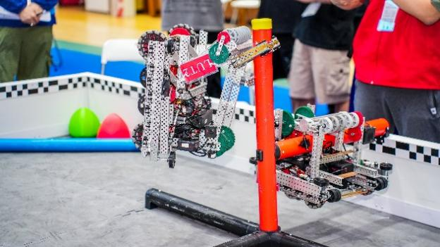 本届VEX U的竞赛主题为粽横天下。两支赛队各控制两台机器人在45秒自动赛时段和75秒手动控制时段的赛局中竞争。按照规则,参赛队伍需要通过操控机器人获得棕球进球,最终以粽球进球数量和赛局结束时的高挂两个因素来一决高下。