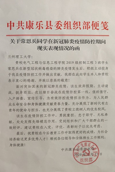 不忘初心,勇担使命。在全民抗疫的非常时期,电信学院研究生积极响应学校疫情防控小组的倡议,奋力投身各地疫情防控攻坚战中。近日,学校收到康乐县委组织部来函,对电信学院2019级控制工程专业研究生常恩兵同学,在疫情防控工作期间,主动请战,勇于分担防疫任务的现实表现进行了认定。