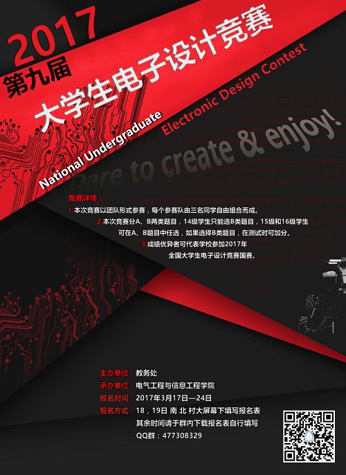 为加强学生实践能力和创新意识的培养,提高我校大学生电子设计的能力和水平,鼓励大学生踊跃参加课外科技活动,学校决定举办第九届(2017年)兰州理工大学大学生电子设计竞赛。现将有关事宜通知如下: