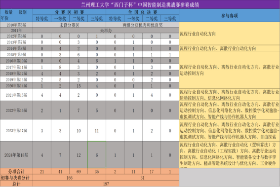 自 2011 年至 2024 年,兰州理工大学团队在CIMC中取得了显著成绩。累计获得全国特、一、二等奖 2 项、11 项、17 项,以及分赛区初赛 166 项,合计 196 项奖。这样的成绩在全国院校中名列前茅,充分展示了学校在智能制造领域的教学实力和人才培养成果。这些优秀的成绩激励着同学们积极投身赛事,追求卓越,为学校争光添彩。