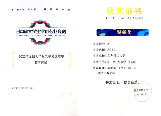 2023年全国大学生电子设计竞赛甘肃赛区由甘肃省教育厅主办,兰州理工大学承办,竞赛分为初赛、测评和综合测评三个阶段。最终,兰州理工大学获奖情况:全国二等奖1项,省级特等奖6项,省级一等奖3项,省级二等奖5项。