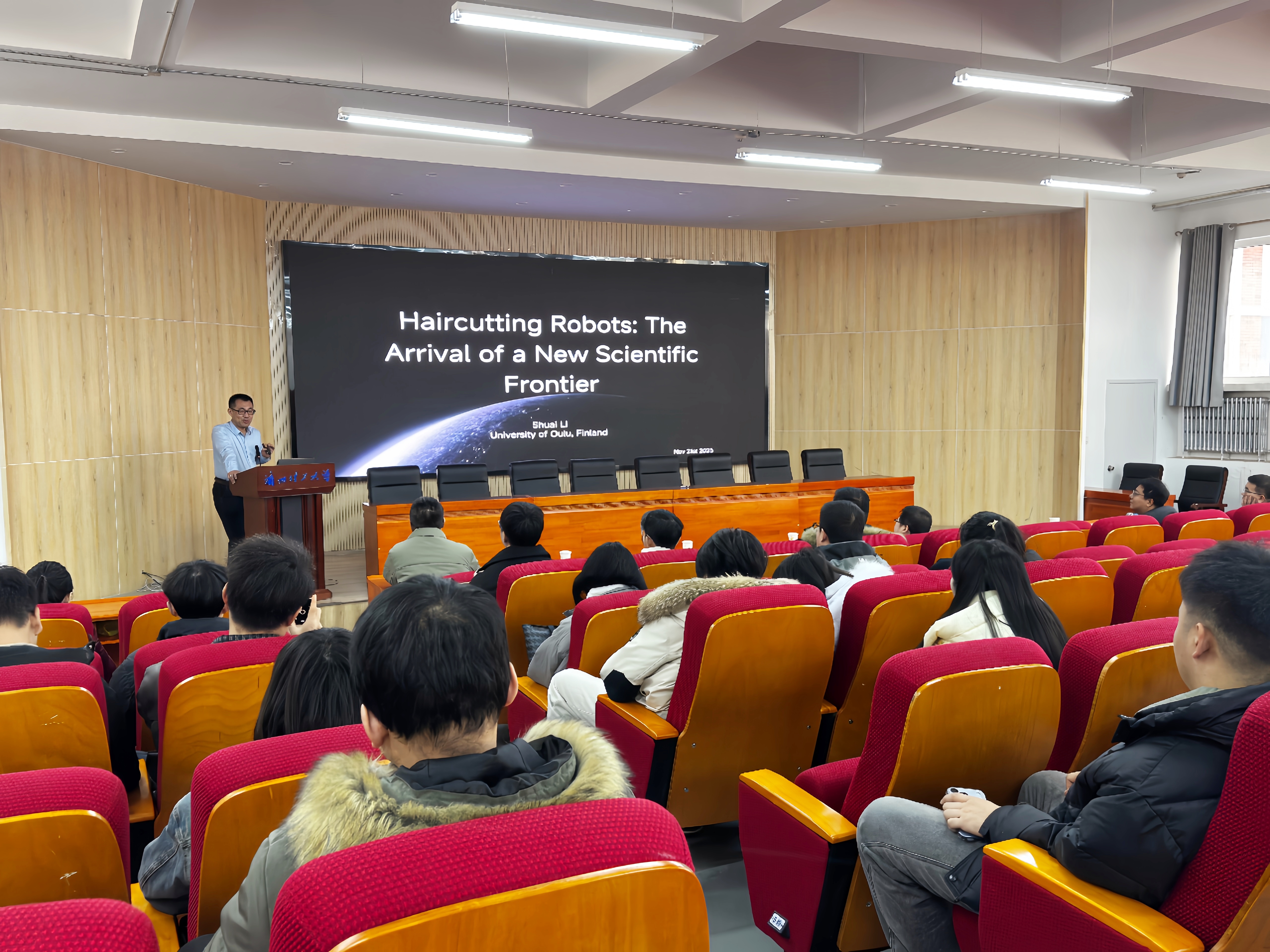 安孝晟教授以“Matrix-Weighted Graphs: Connectedness from a Consensus Perspective”为题,深入阐述矩阵加权图如何刻画无向图与有向图的动态行为特性,重点探讨当边的权重为正定矩阵时,顶点之间的连接问题,为复杂网络分析提供了新的理论视角。李帅教授以“Haircutting Robots: A New Engineering Landscape”为题,分享了其团队在理发机器人领域的最新研究进展,融合机器人技术、人工智能和美学设计等多学科知识,以应对精度、安全性和定制化等实际挑战。