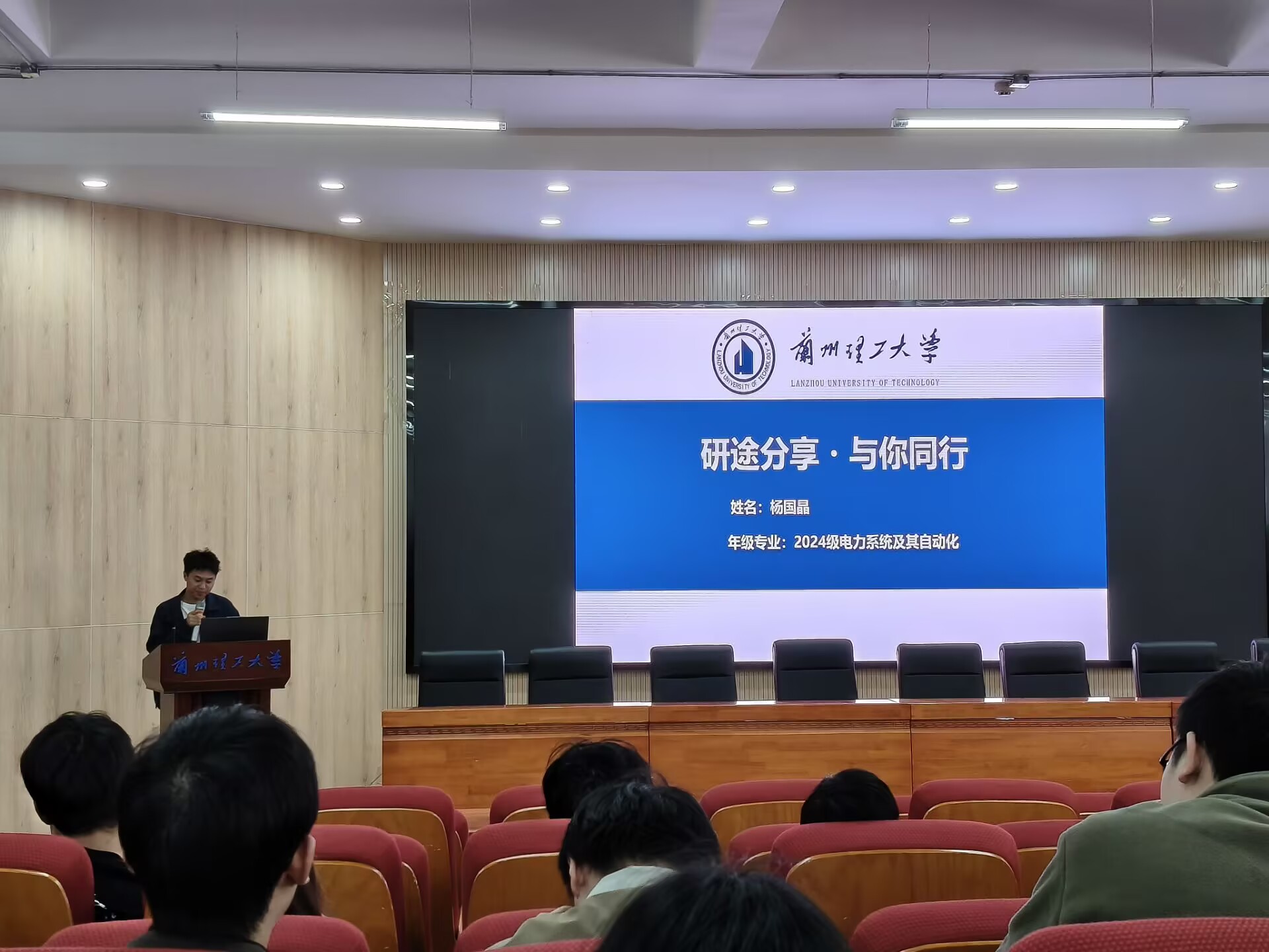 会上,首先分享的是2024级电力系统及其自动化专业的省级三好学生杨国晶,他以“研途分享・与你同行”为题,结合自身在双碳科技、电动汽车充电设施规划等科研竞赛中的丰硕成果,以及丰富的志愿服务经历,鼓励同学们砥志研思、甘于奉献;随后,进行分享的是2024级高电压与绝缘技术专业的校级优秀研究生干部吴佳壕,他聚焦成长学习生涯进行分享。他从扎实的专业课成绩切入,深入分享了自身在参与国际访学交流与乡村电力发展调研中的宝贵实践经验,勉励大家拓宽视野,脚踏实地,“努力让优秀成为一种习惯”。